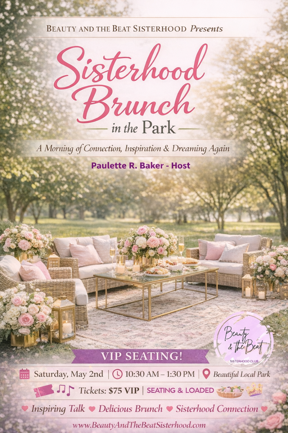 This special experience is hosted by Paulette R. Baker, Coach and Founder of Beauty and the Beat Sisterhood, who has thoughtfully prepared a beautiful part of the day just for you. So invite your girlfriends, come enjoy the atmosphere, and make memories with us in a setting designed to uplift, pour into, and inspire every woman who attends.